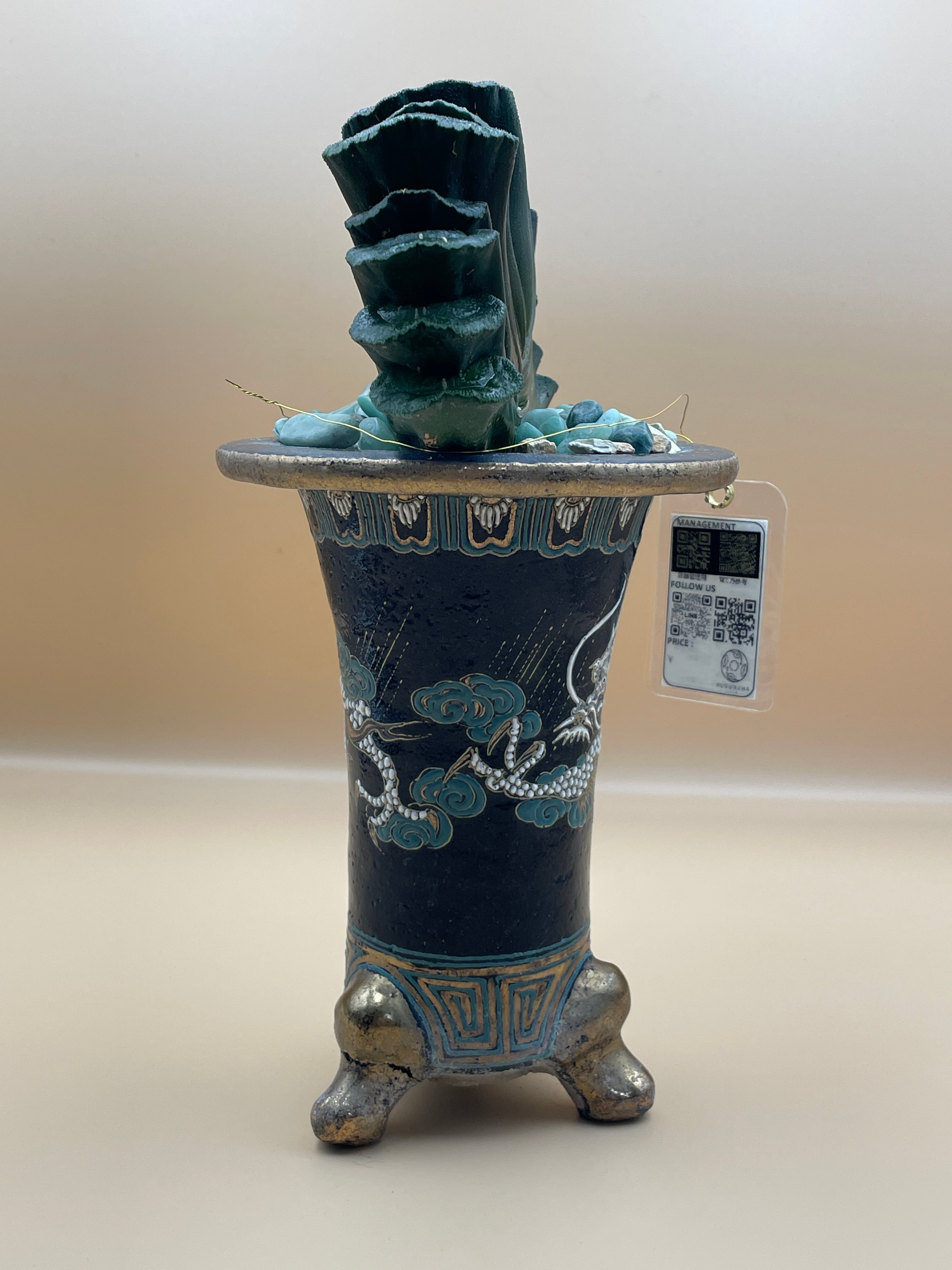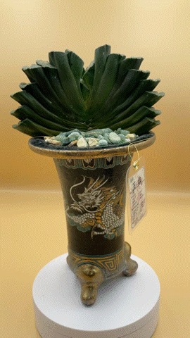 今回は、その和の造形美をさらに引き立てるため、気品ある「万年青鉢」に植え込み、化粧砂には「グリーンの天然石」をあしらいました。このままインテリアとして、日常に癒しを添える「生きた芸術品」としてお楽しみいただけます。