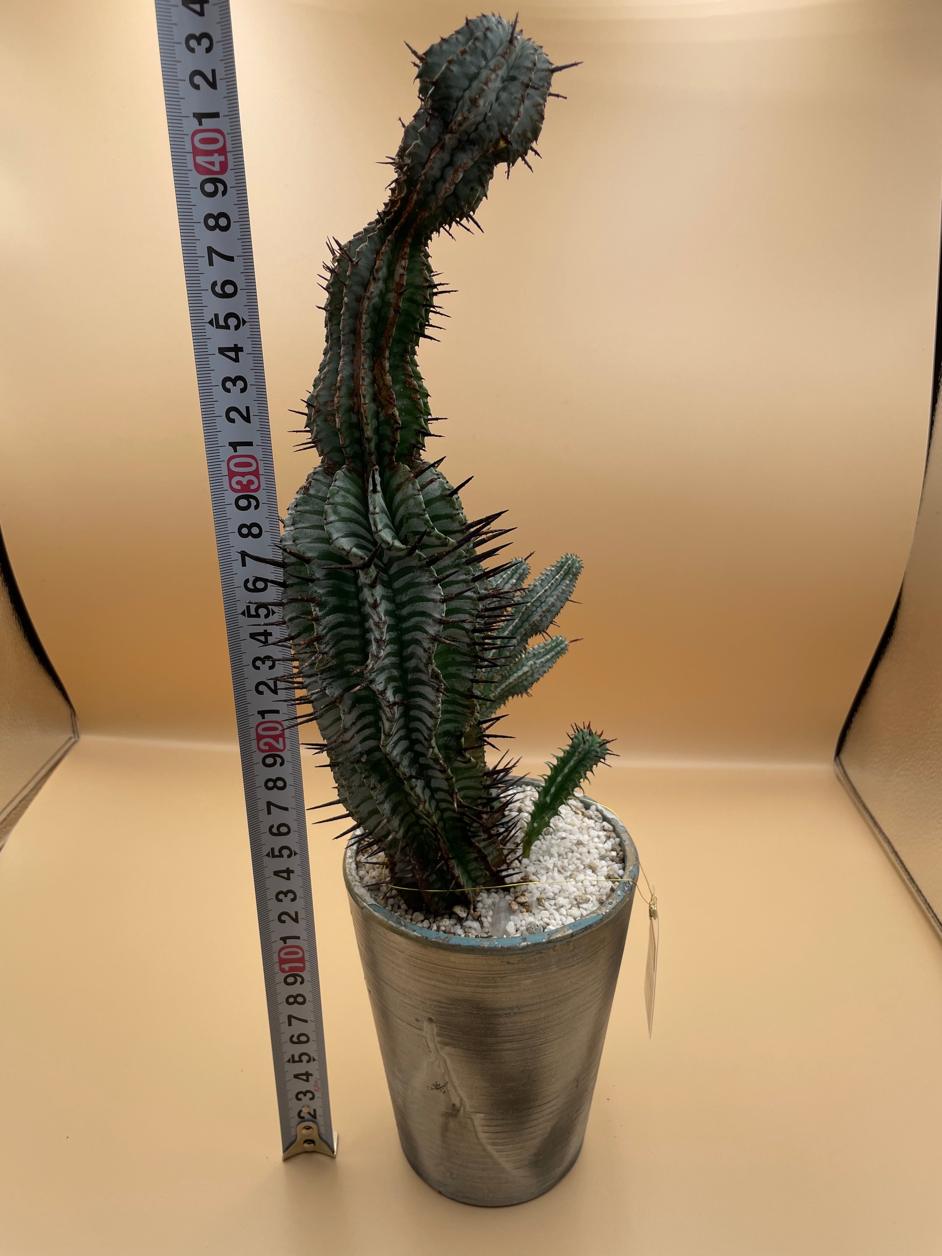 本個体は、流通サイズを遥かに凌ぐ「高さ約30cm」の特大サイズ。これほどの大きさで、なおかつ頂部から基部まで途切れることなく鮮明なゼブラ模様を維持している株は、市場でも滅多にお目にかかれない至高の一株です。