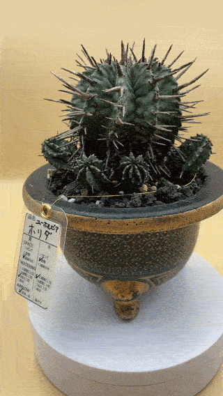 その独特な稜線(りょうせん)と、白く粉を吹いたような肌質、そして力強い棘が愛好家を惹きつけてやまない「ユーフォルビア・ホリダ」。本株は、均整の取れた親株の美しさはもちろん、その周囲を囲むように連なる「計9個(大小含む)」の子株が圧倒的な存在感を放つ、非常に希少な群生個体です。