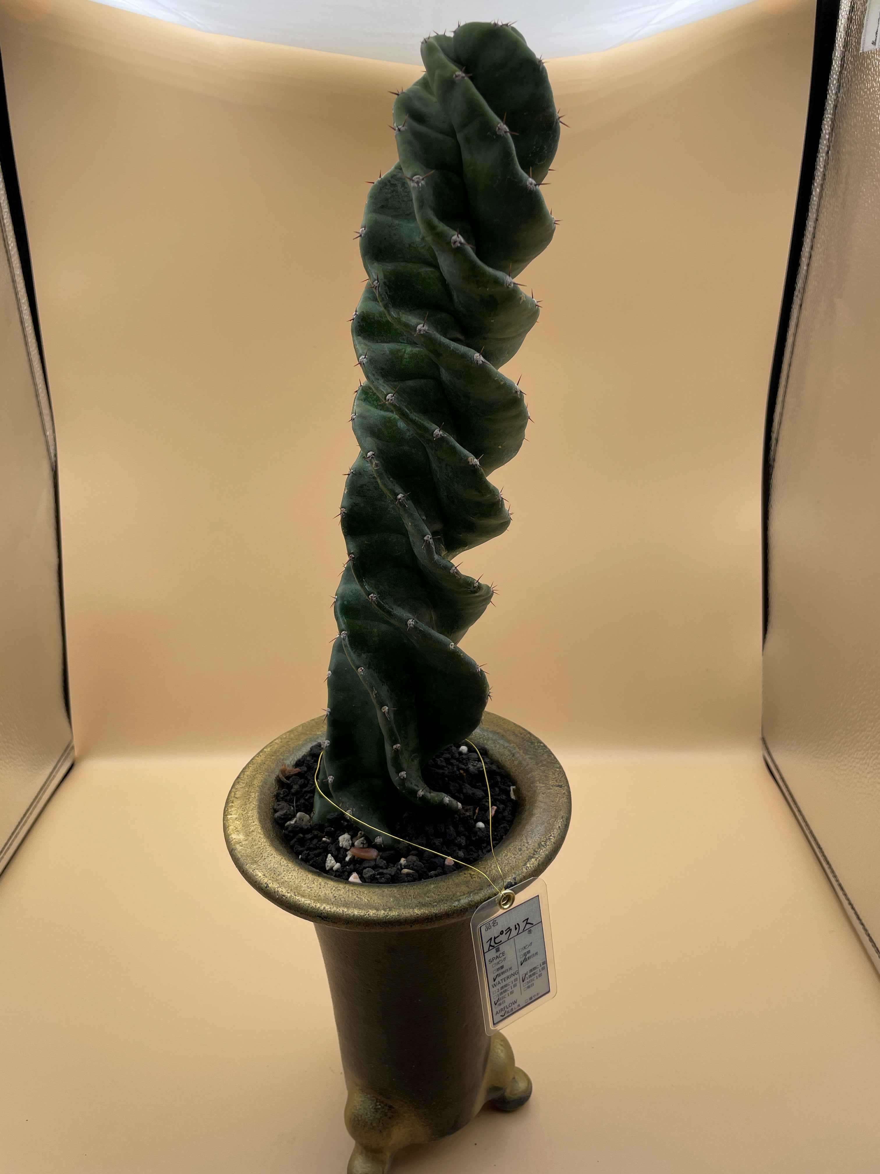 サボテンの中でも、その特異な成長スタイルからコレクターを魅了してやまない「セレウス・ペルビアナス “スピラリス”」。本株は、根本から天辺まで澱みなく、美しい螺旋を描きながら成長した選抜個体です。